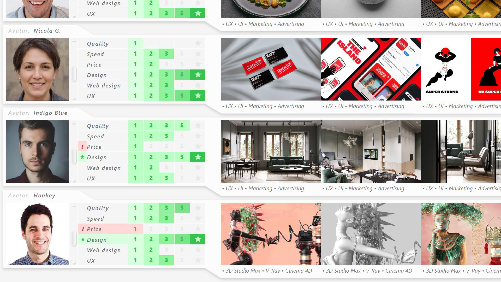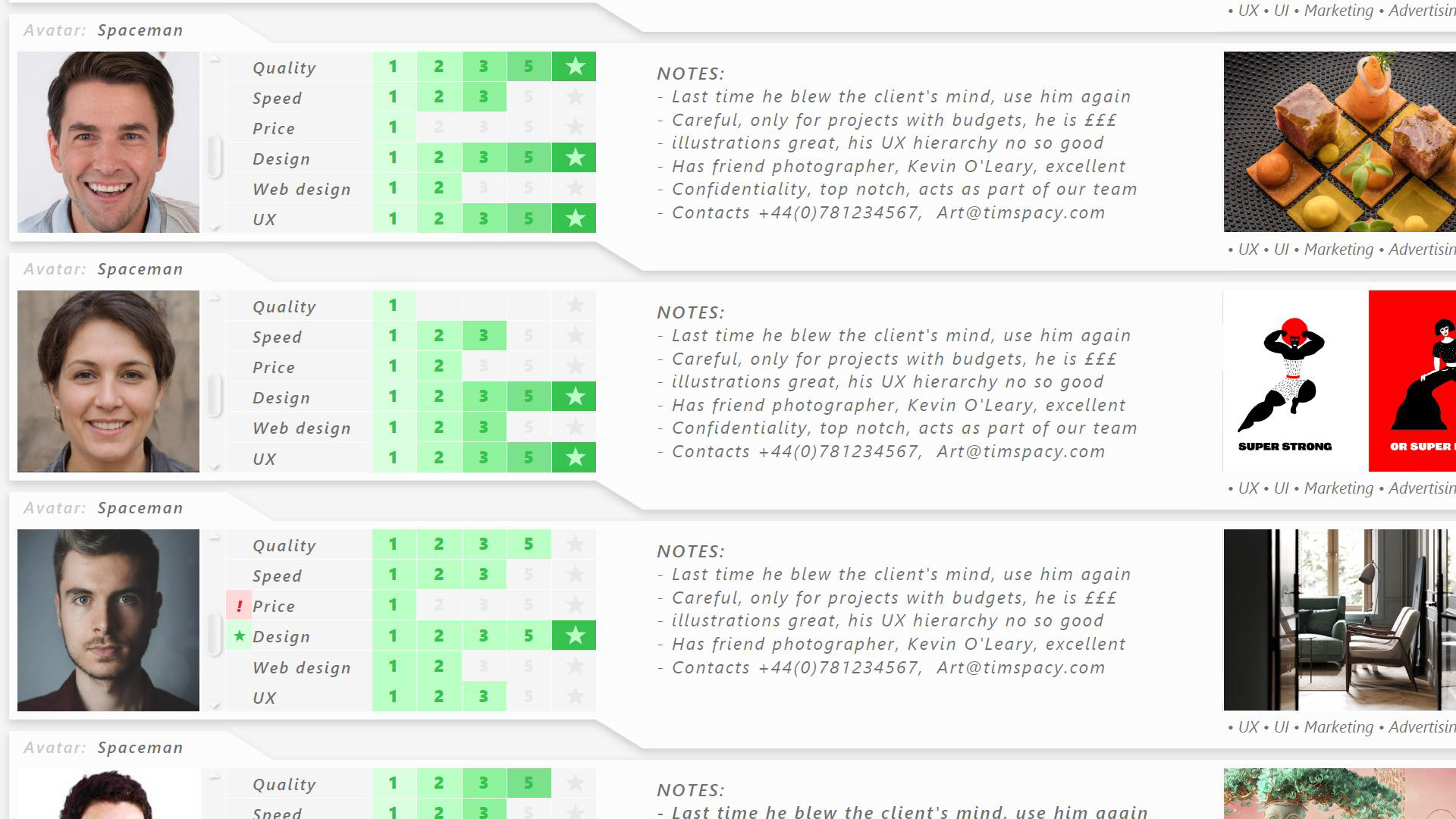 The App helps creative agencies manage and share their database of freelancers by assigning rating, skill ratings, punctuality, fee levels, and other attributes. The Agency can share the profiles of its freelancers with a potential client and ask the client to choose the freelancer to work on their project. All freelancers have Aliases, and not their real names, which will ensure the freelancer does not work directly with the end client. Choosing the right freelancer is important because the client can not get work which is Good, Fast, and Cheap at the same time. The client decides what is important for each project and chooses the right person based on his ratings on his speed of completion, attention to detail, price per hour, etc. At the end of the project the client rates the freelancer. The App starts by showcasing Projects Portfolio and the skills used to complete each project. Then the app shows ratings of all the skills a freelancer has. Finally, once logged in, the user can store personal notes against each freelancer, for example names of the projects he worked on, the quotes they received from him, if he met all deadlines, etc.